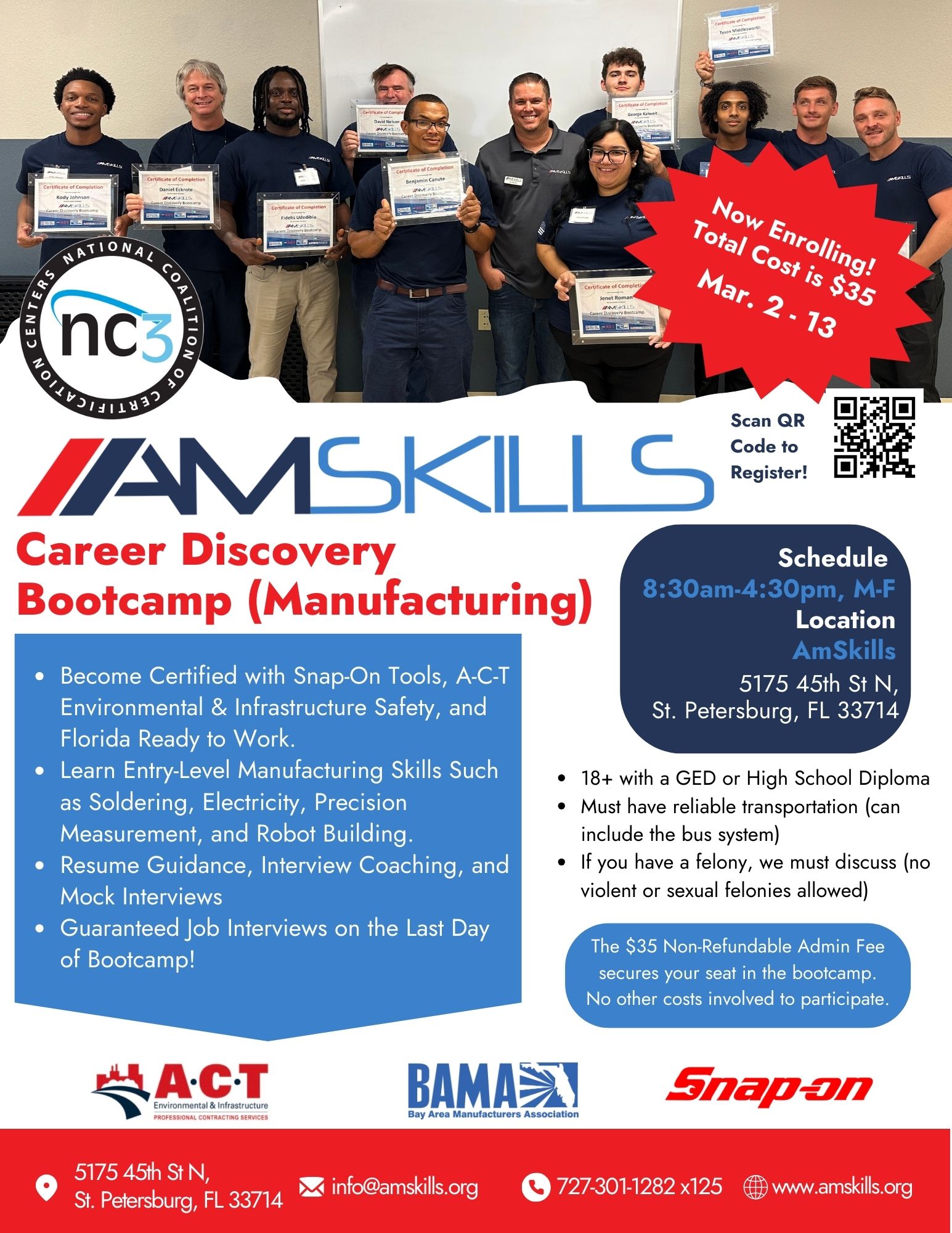 Lealman Exchange 5175 45TH ST N, Lealman, FL, United StatesCareer Discovery Bootcamp The 2-week Bootcamp ($35 Total) consists of: • Multiple Hands-On Projects • Print Reading and Precision Measurement • Intro to Soldering, Electrical & Mechatronics • Tour of Local Manufacturer • NC3 (5) Snap-On Tools Credentials • Half-day Industry Safety Course (A.C.T Environmental & Infrastructure) • Employability Skills Assessment (Florida Ready to Work) […]